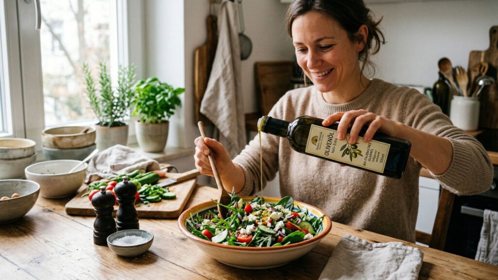 Extra natives Olivenöl bringt einen charakteristischen Geschmack mit und eignet sich daher besonders für herzhafte Gerichte wie Ofengemüse oder Pasta. Mit einem niedrigen Rauchpunkt (ca. 110 °C) ist es weniger zum scharfen Anbraten geeignet.